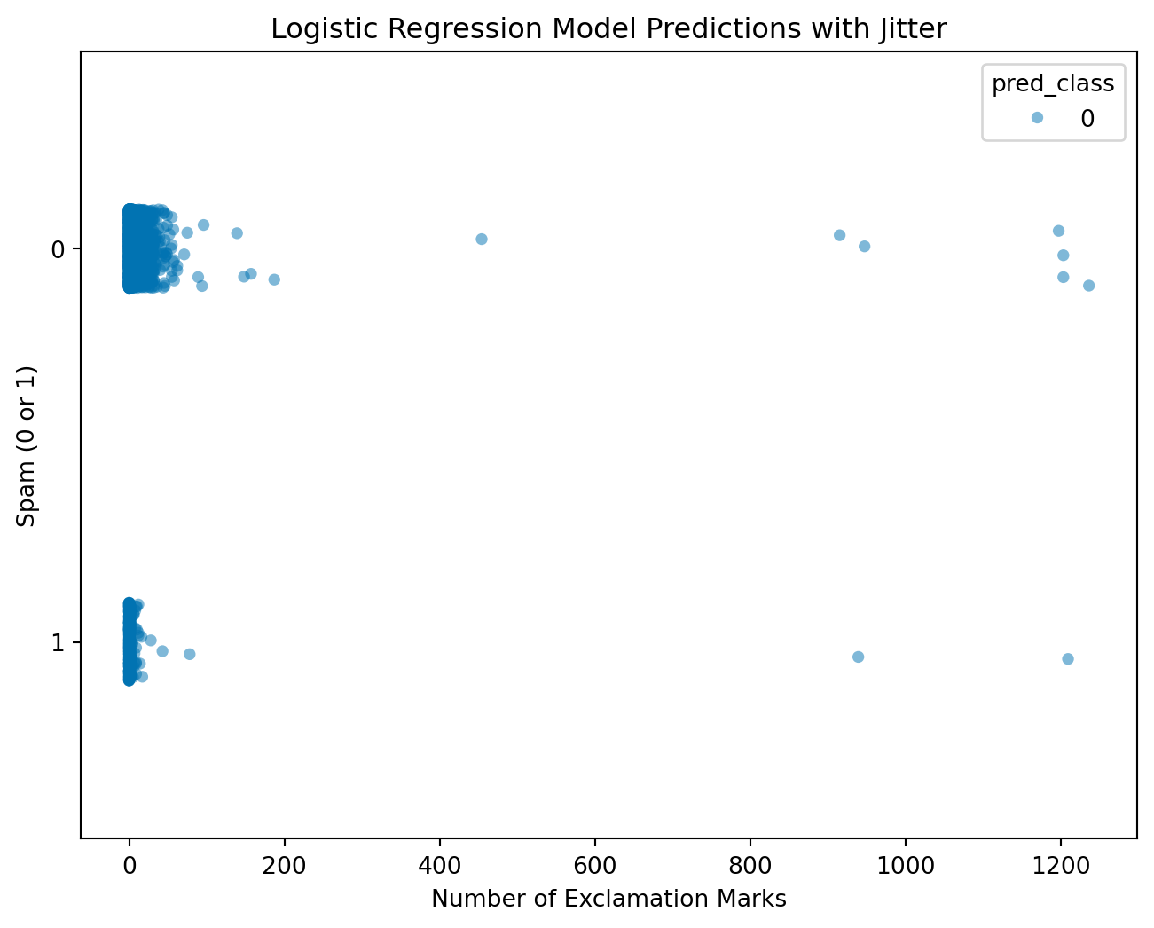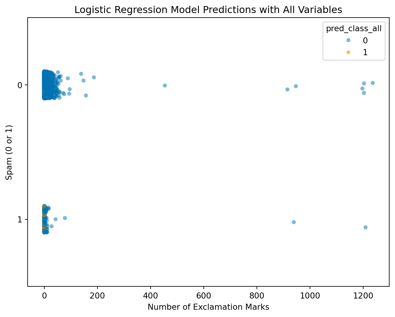 - Fit the logistic regression model using the number of exclamation points to predict the probability an email is spam.