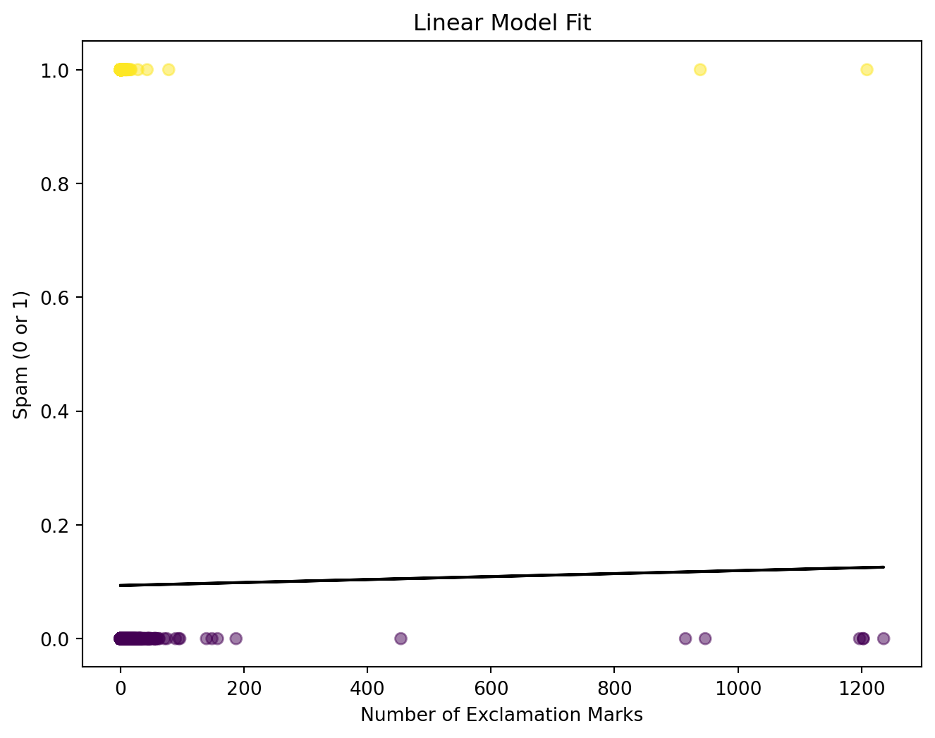 Suppose we try using a linear model to describe the relationship between the number of exclamation points and whether an email is spam. Write up a linear model that models spam by exclamation marks.
