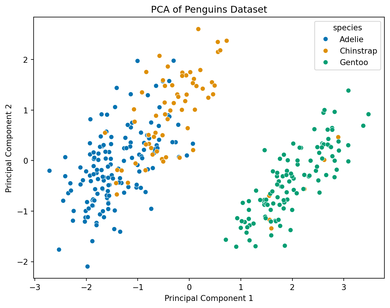 Visualize the PCA Result: Create a scatter plot of the principal components to visualize the clustering of different penguin species.