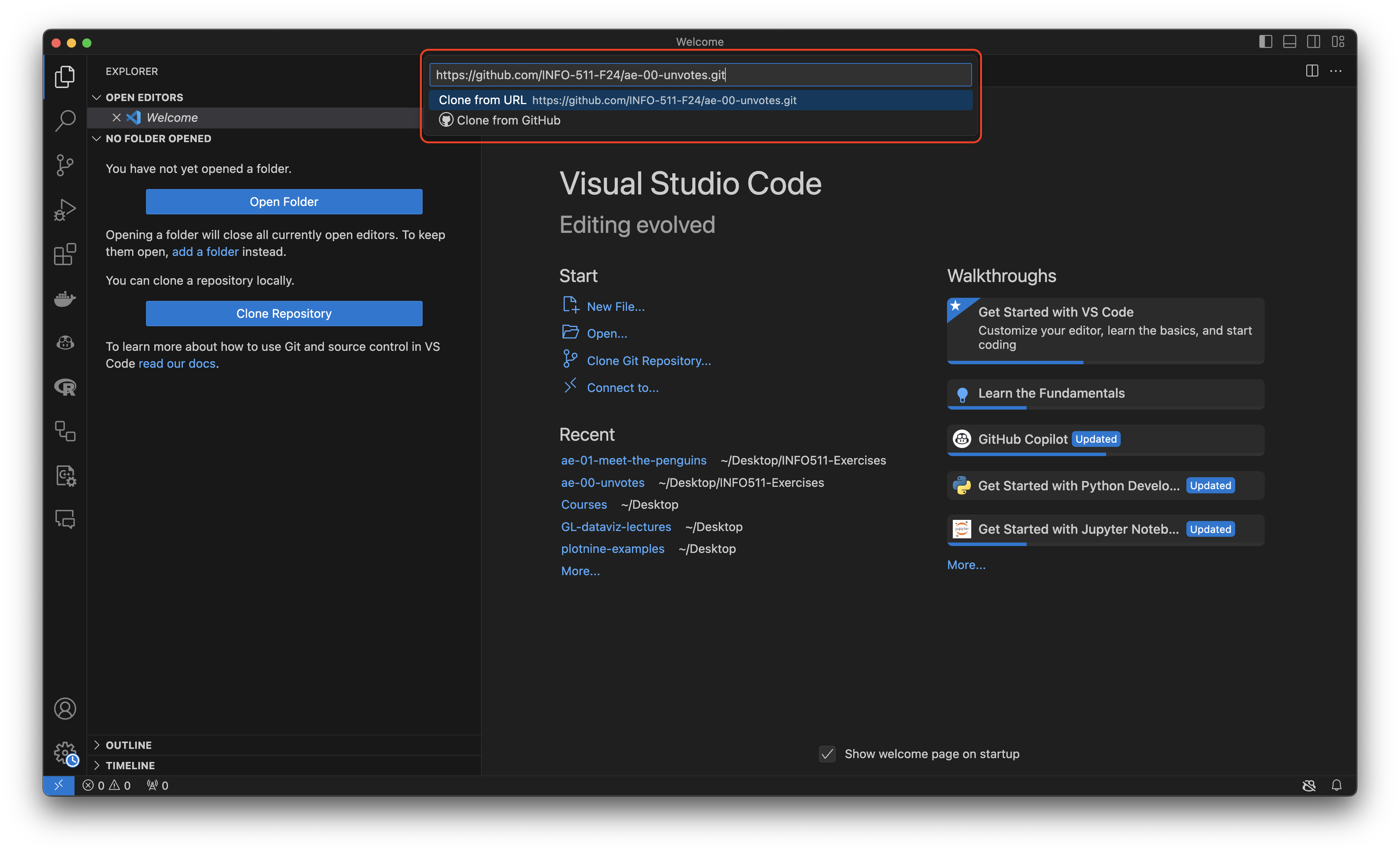 - Paste the following into the text input that pops up in the top-middle: https://github.com/INFO-511-F24/ae-00-unvotes.git, which can be found at the