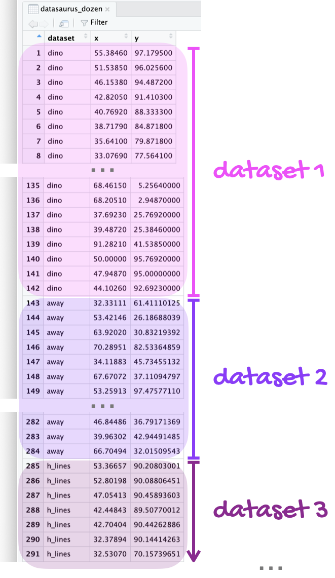 If it’s confusing that the data frame is called datasaurus_dozen when it contains 13 datasets, you’re not alone! Have you heard of a baker’s dozen?