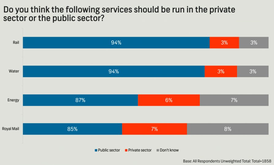 Load the data for this survey from data/survation.csv. Confirm that the data match the percentages from the visualization. That is, calculate the percentages of public sector, private sector, don’t know for each of the services and check that they match the percentages from the plot.
