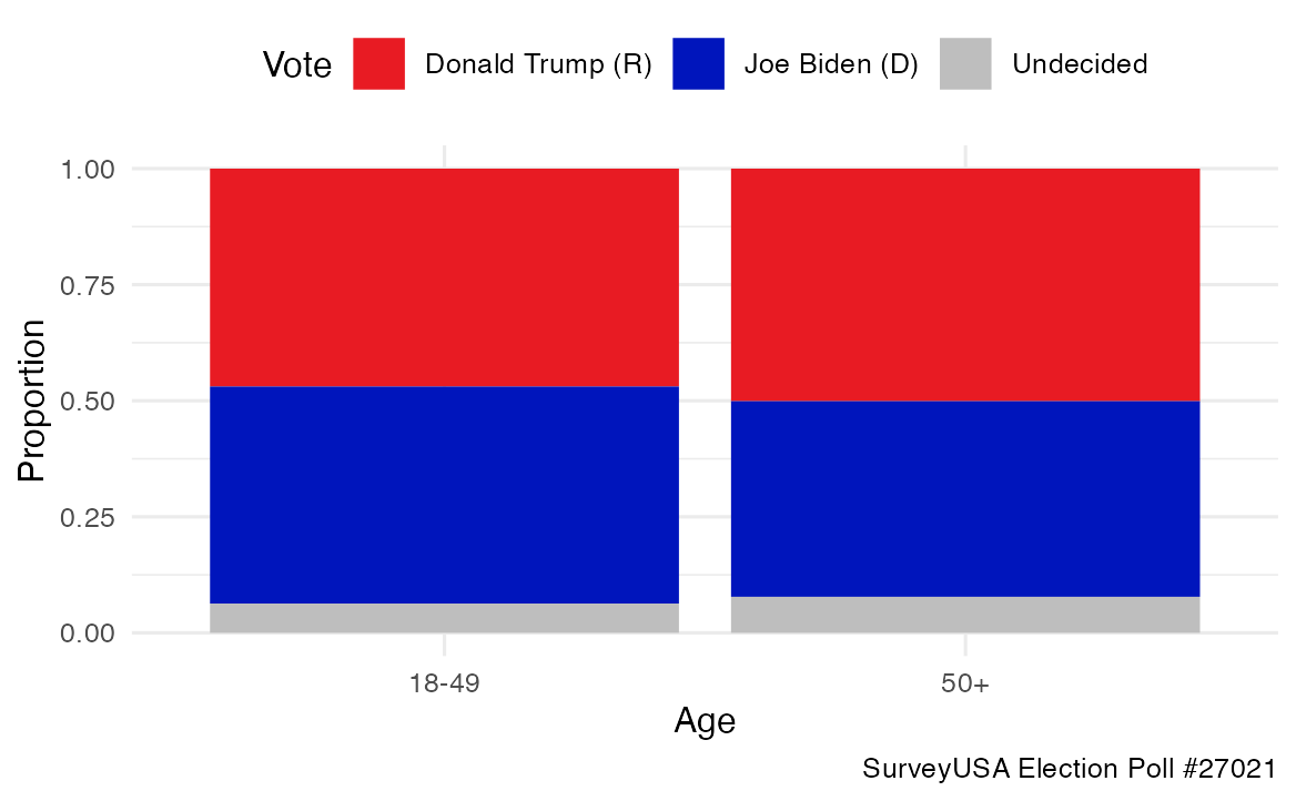 Of the 1,048 responses, 507 were between the ages of 18-49. Of the individuals that are between 18-49, 238 individuals responded that they would vote for Donald Trump, 237 said they would vote for Joe Biden, and the remainder were undecided. Of the individuals that are 50+, 271 individuals responded that they would vote for Donald Trump, 228 said they would vote for Joe Biden, and the remainder were undecided.