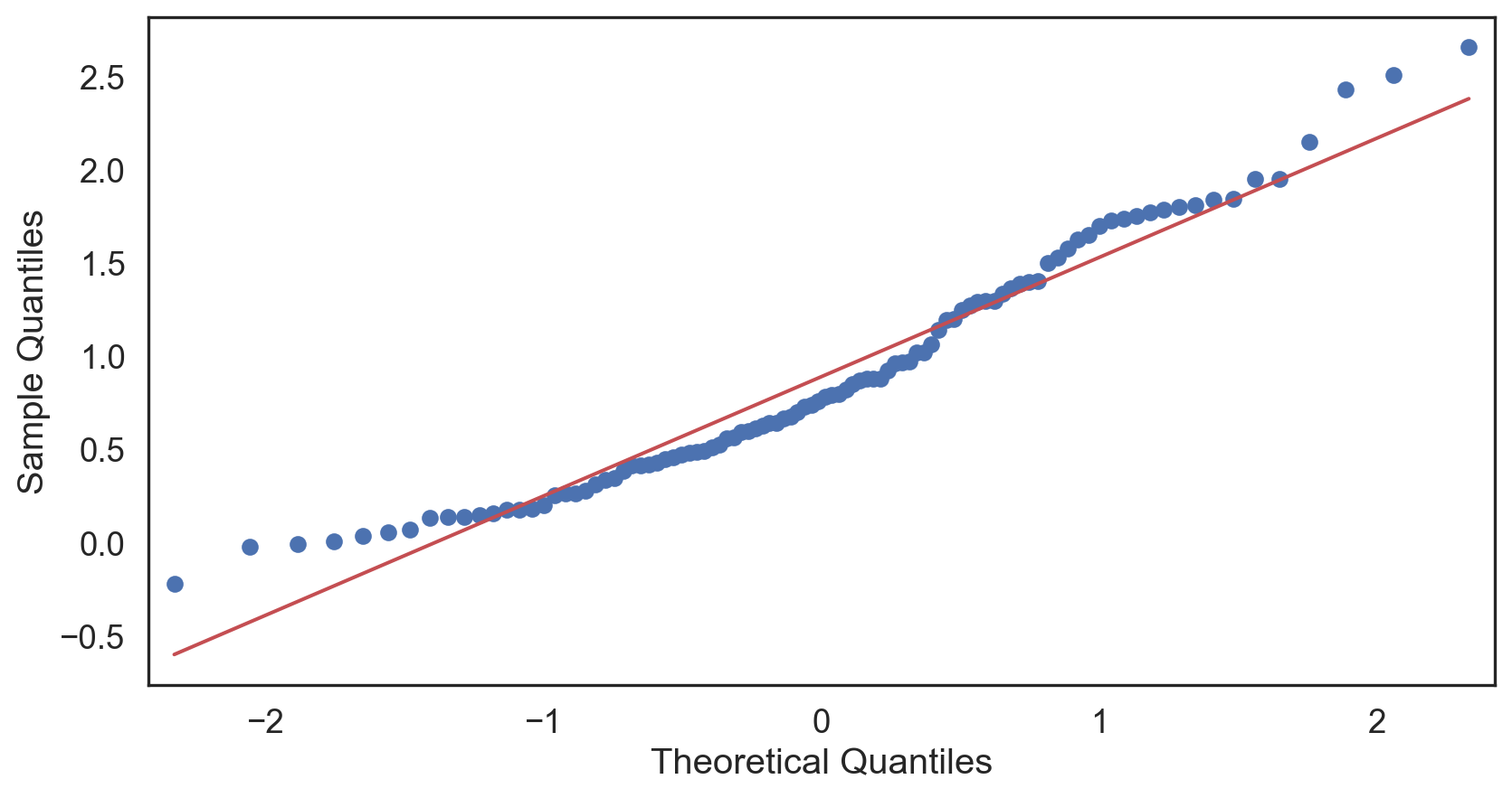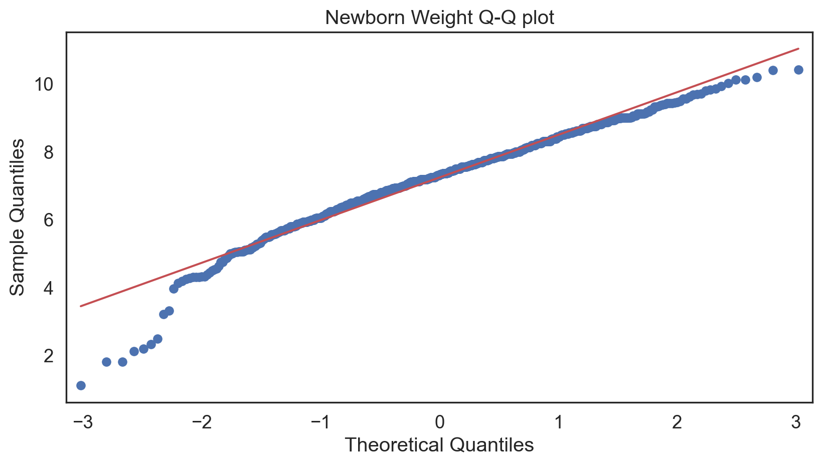 # Make a copy of the data dataCopy = births14.copy()# Remove NAsdataCopyFin = dataCopy.dropna()# Q-Q plotsm.qqplot(dataCopyFin.weight, line='s')plt.title('Newborn Weight Q-Q plot')plt.show()# Make a copy of the data dataCopy = births14.copy()# Remove NAsdataCopyFin = dataCopy.dropna()# Q-Q plotsm.qqplot(dataCopyFin.weight, line='s')plt.title('Newborn Weight Q-Q plot')plt.show()# Make a copy of the data dataCopy = births14.copy()# Remove NAsdataCopyFin = dataCopy.dropna()# Q-Q plotsm.qqplot(dataCopyFin.weight, line='s')plt.title('Newborn Weight Q-Q plot')plt.show()# Make a copy of the data dataCopy = births14.copy()# Remove NAsdataCopyFin = dataCopy.dropna()# Q-Q plotsm.qqplot(dataCopyFin.weight, line='s')plt.title('Newborn Weight Q-Q plot')plt.show()# Make a copy of the data dataCopy = births14.copy()# Remove NAsdataCopyFin = dataCopy.dropna()# Q-Q plotsm.qqplot(dataCopyFin.weight, line='s')plt.title('Newborn Weight Q-Q plot')plt.show()# Make a copy of the data dataCopy = births14.copy()# Remove NAsdataCopyFin = dataCopy.dropna()# Q-Q plotsm.qqplot(dataCopyFin.weight, line='s')plt.title('Newborn Weight Q-Q plot')plt.show()# Make a copy of the data dataCopy = births14.copy()# Remove NAsdataCopyFin = dataCopy.dropna()# Q-Q plotsm.qqplot(dataCopyFin.weight, line='s')plt.title('Newborn Weight Q-Q plot')plt.show()