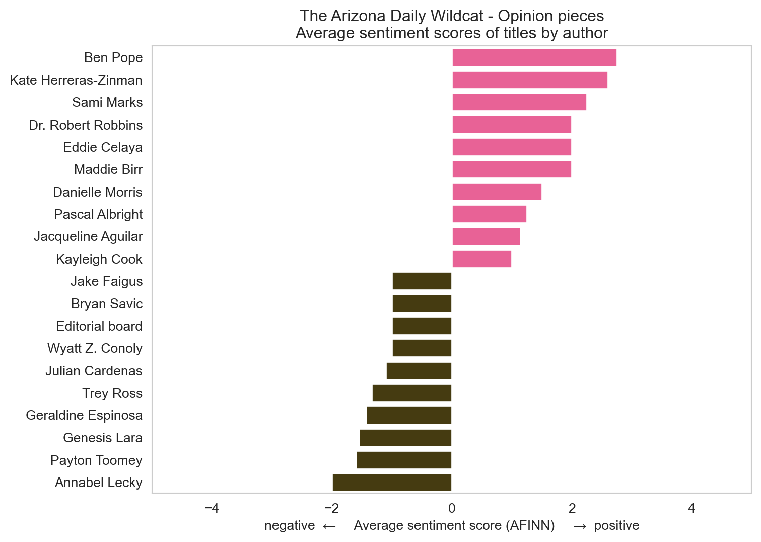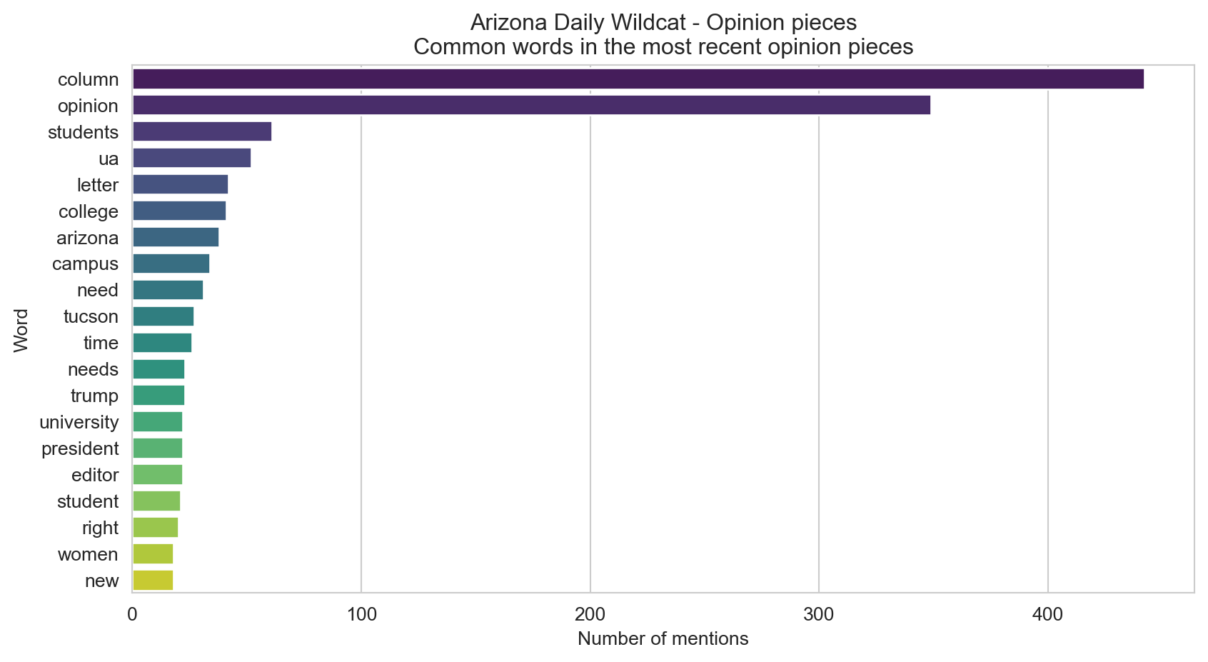 stop_words =set(stopwords.words('english'))wildcat['tokens'] = wildcat['title'].apply(lambda x: [word.lower() for word in word_tokenize(x) if word.isalpha() and word.lower() notin stop_words])word_counts = Counter(word for title in wildcat['tokens'] for word in title)common_words = pd.DataFrame(word_counts.most_common(20), columns=['word', 'count'])plt.figure(figsize=(10, 5))sns.barplot(x='count', y='word', data=common_words, palette='viridis')plt.xlabel('Number of mentions')plt.ylabel('Word')plt.title('Arizona Daily Wildcat - Opinion pieces\nCommon words in the most recent opinion pieces')plt.show()stop_words =set(stopwords.words('english'))wildcat['tokens'] = wildcat['title'].apply(lambda x: [word.lower() for word in word_tokenize(x) if word.isalpha() and word.lower() notin stop_words])word_counts = Counter(word for title in wildcat['tokens'] for word in title)common_words = pd.DataFrame(word_counts.most_common(20), columns=['word', 'count'])plt.figure(figsize=(10, 5))sns.barplot(x='count', y='word', data=common_words, palette='viridis')plt.xlabel('Number of mentions')plt.ylabel('Word')plt.title('Arizona Daily Wildcat - Opinion pieces\nCommon words in the most recent opinion pieces')plt.show()stop_words =set(stopwords.words('english'))wildcat['tokens'] = wildcat['title'].apply(lambda x: [word.lower() for word in word_tokenize(x) if word.isalpha() and word.lower() notin stop_words])word_counts = Counter(word for title in wildcat['tokens'] for word in title)common_words = pd.DataFrame(word_counts.most_common(20), columns=['word', 'count'])plt.figure(figsize=(10, 5))sns.barplot(x='count', y='word', data=common_words, palette='viridis')plt.xlabel('Number of mentions')plt.ylabel('Word')plt.title('Arizona Daily Wildcat - Opinion pieces\nCommon words in the most recent opinion pieces')plt.show()stop_words =set(stopwords.words('english'))wildcat['tokens'] = wildcat['title'].apply(lambda x: [word.lower() for word in word_tokenize(x) if word.isalpha() and word.lower() notin stop_words])word_counts = Counter(word for title in wildcat['tokens'] for word in title)common_words = pd.DataFrame(word_counts.most_common(20), columns=['word', 'count'])plt.figure(figsize=(10, 5))sns.barplot(x='count', y='word', data=common_words, palette='viridis')plt.xlabel('Number of mentions')plt.ylabel('Word')plt.title('Arizona Daily Wildcat - Opinion pieces\nCommon words in the most recent opinion pieces')plt.show()stop_words =set(stopwords.words('english'))wildcat['tokens'] = wildcat['title'].apply(lambda x: [word.lower() for word in word_tokenize(x) if word.isalpha() and word.lower() notin stop_words])word_counts = Counter(word for title in wildcat['tokens'] for word in title)common_words = pd.DataFrame(word_counts.most_common(20), columns=['word', 'count'])plt.figure(figsize=(10, 5))sns.barplot(x='count', y='word', data=common_words, palette='viridis')plt.xlabel('Number of mentions')plt.ylabel('Word')plt.title('Arizona Daily Wildcat - Opinion pieces\nCommon words in the most recent opinion pieces')plt.show()stop_words =set(stopwords.words('english'))wildcat['tokens'] = wildcat['title'].apply(lambda x: [word.lower() for word in word_tokenize(x) if word.isalpha() and word.lower() notin stop_words])word_counts = Counter(word for title in wildcat['tokens'] for word in title)common_words = pd.DataFrame(word_counts.most_common(20), columns=['word', 'count'])plt.figure(figsize=(10, 5))sns.barplot(x='count', y='word', data=common_words, palette='viridis')plt.xlabel('Number of mentions')plt.ylabel('Word')plt.title('Arizona Daily Wildcat - Opinion pieces\nCommon words in the most recent opinion pieces')plt.show()